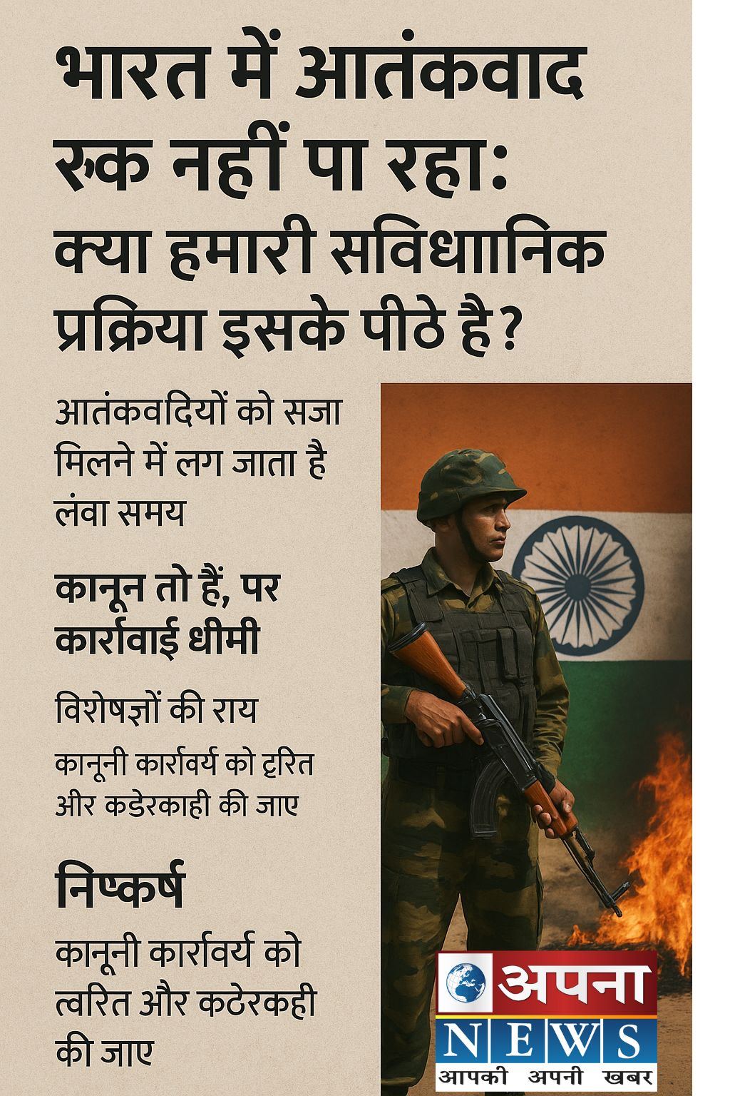 भारत में आतंकवादी घटनाएँ समय-समय पर सामने आती रहती हैं। सुरक्षा एजेंसियों की कोशिशों और सख्त कानूनों के बावजूद, आतंकवाद पूरी तरह से खत्म नहीं हो पाया है। विशेषज्ञों का मानना है कि इसका एक बड़ा कारण हमारी संविधानिक और न्यायिक प्रक्रिया की धीमी रफ्तार भी है।