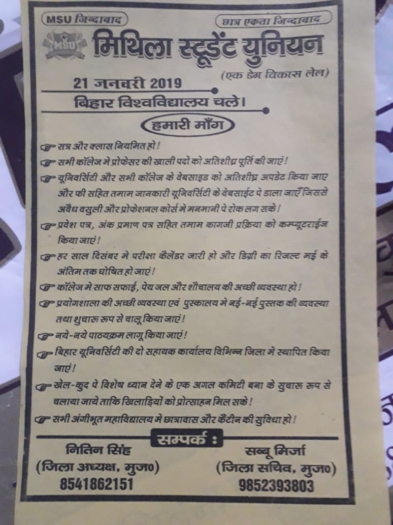 अंत में बिहार के विद्यार्थियों को आगे आना पड़ रहा है. बिहार यूनिवर्सिटी काफी समय से इसी तरह काम कर रही है यहां पर विद्यार्थियों का सुनने वाला कोई भी नहीं है. इसी के सिलसिले में मिथिला स्टूडेंट युनियन 21 जनवरी छात्र प्रदर्शन करने जा रहा है इस प्रदर्शन में काफी से काफी संख्या में विद्यार्थी भाग ले रहे हैं. यह प्रदर्शन मुजफ्फरपुर के आम गोला के पास होने जा रहा है अधिक से अधिक संख्या में विद्यार्थी इस प्रदर्शन में भाग ले और शिक्षा व्यवस्था को सही करें.