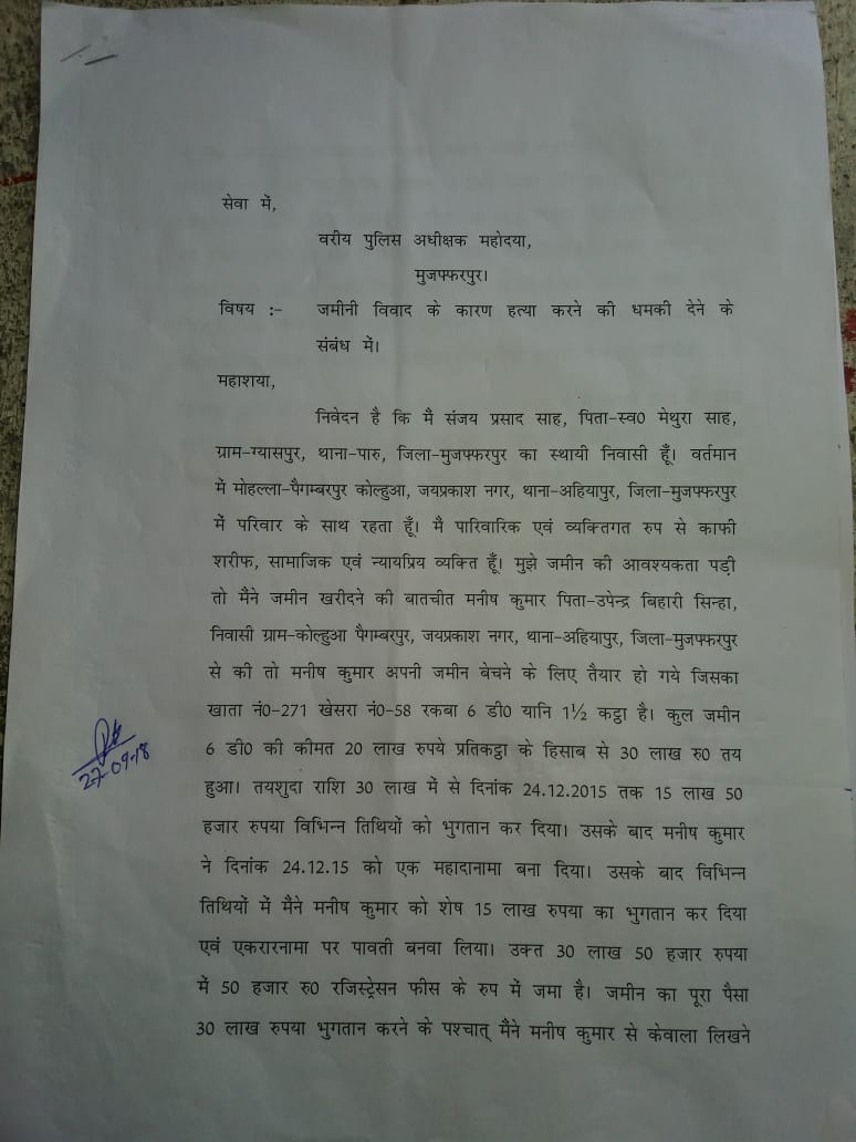 घटना इस तरह की है कि कुछ समय पहले संजय कुमार ने एक जमीन के लिए भू माफिया को पैसा दिया था. भु-माफिया मनीष कुमार पिता- स्वगीय उपेन्द्र बिहारी, ग्राम-पैगम्बरपुर कोल्लुआ, थाना-अहियापुर, जिला- मुजफ्फरपुर को जमीन के लिए 30 लाख 50 हजार रूपया दिया था रूपये का फूल भुगतान होने के बावजूद जमीन नही लिख रहा है.
